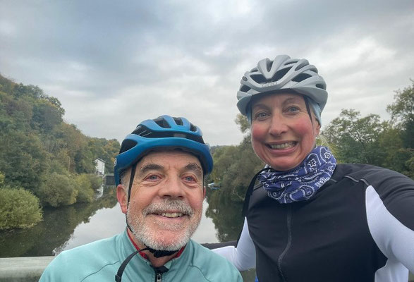 Aus unserer kleinen Trance erwachten wir dann beim ersten langen Anstieg ab Rod an der Weil. Dieser führte uns über Hasselbach, Haintchen und Wolfenhausen auf die Anhöhe über Laubuseschbach, wo wir uns für die herrliche Abfahrt, hinunter nach Aumenau ins Lahntal entschieden. Hier wurde uns ein wenig kühl und Silke war froh, doch schon ihre langen Beinkleider angelegt zu haben. Um wieder warm zu werden zogen wir das Tempo ein wenig an. Obwohl schon oft durchfahren, ist dieser Abschnitt des Lahntalradweges immer wieder ein besonderes, fast schon episches Erlebnis. Das Farbenspiel der herbstlich belaubten Bäume spiegelte sich in der glatten Wasseroberfläche der Lahn und tat sein Übriges dazu. Wirklich ein Rausch für die Sinne!